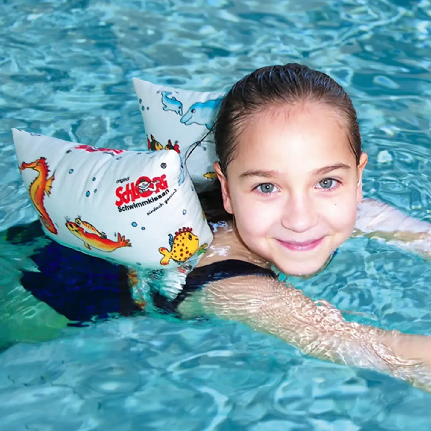 Schlori Schwimkissen bieten völlige Bewegungsfreiheit durch Befestigung unter den Armen oder am Rumpf und sind daher besonders gut zum richtigen Schwimmen lernen geeignet. Eine stufenlose Reduzierung des Auftriebs lässt sich mühelos durch Druck auf die Kissen erreichen und ermöglicht so eine allmähliche Entwöhnung von der Schwimmhilfe.